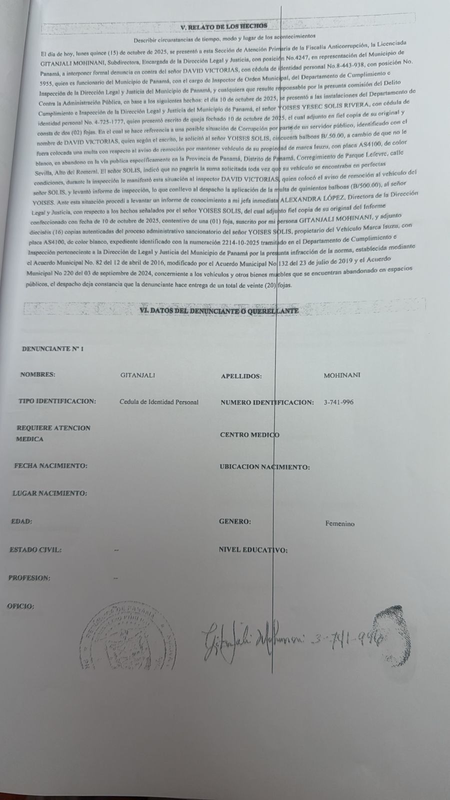 Un escándalo sacude a Parque Lefevre luego de que la Alcaldía de Panamá destituyera al inspector David Victorias, señalado por pedir coima vía Yappy a un contribuyente para “desaparecer” una multa.
